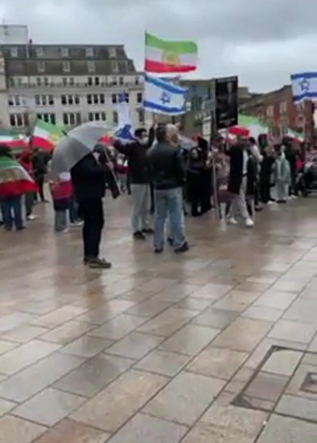 demonstration taking place in a city square. A group of people are gathered, holding Iranian and Israeli flags, along with a banner with a portrait of someone that appears to be Reza Pahlavi. Some people are using umbrellas. The environment suggests a European setting, with brick buildings around the square. The square is paved with light-colored rectangular stones.