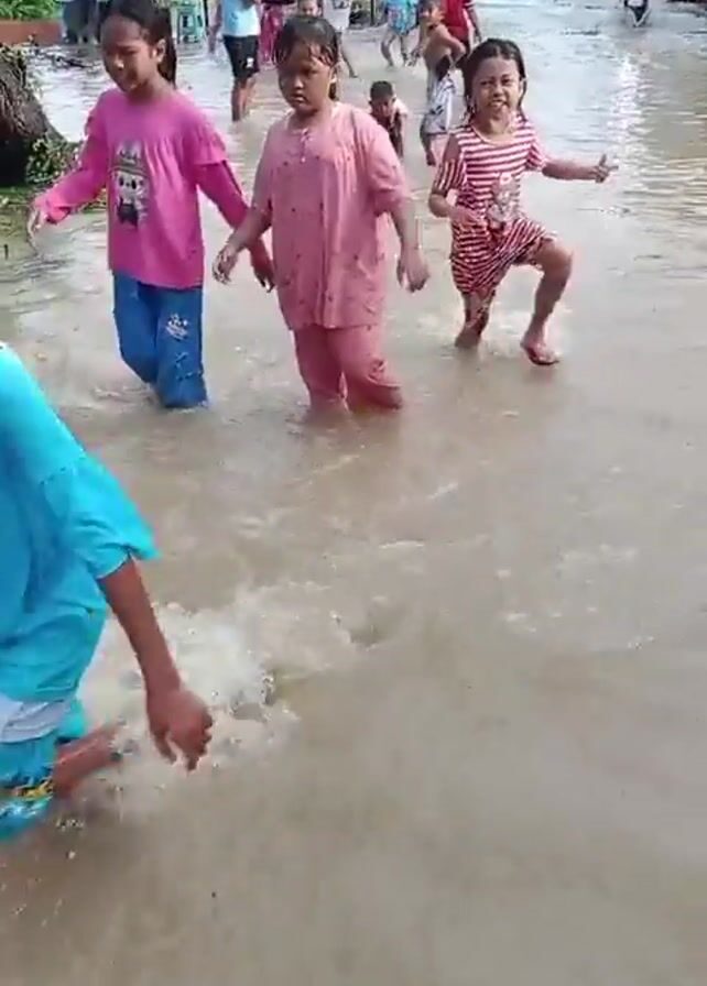 flooded street with several children playing in the water. The water appears murky and brown. Children are seen running and splashing through the water, some wearing clothes and others in swimwear. There are adults standing on the sides of the street watching the children. A person on a moped drives through the flood water. The street is lined with houses and trees, and power lines are visible overhead.