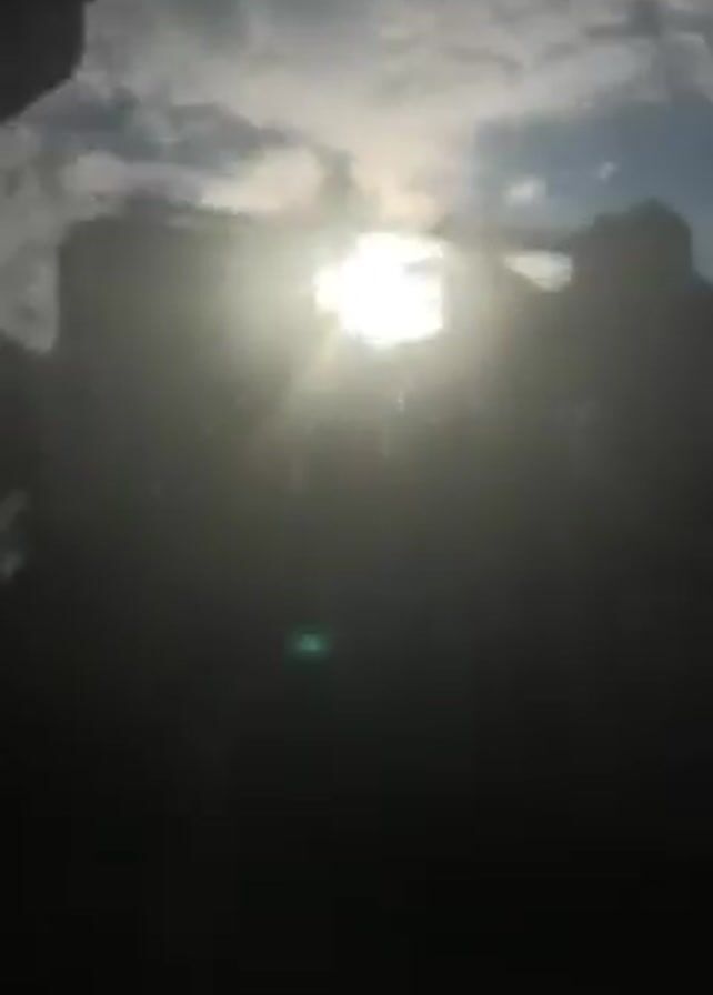 view from inside a vehicle, looking out through the windshield at a partly cloudy sky with the sun shining through the clouds. There are trees and a tall building in the background, and some cars and a white trailer visible below. The camera appears to be moving, possibly as the vehicle is driving.
