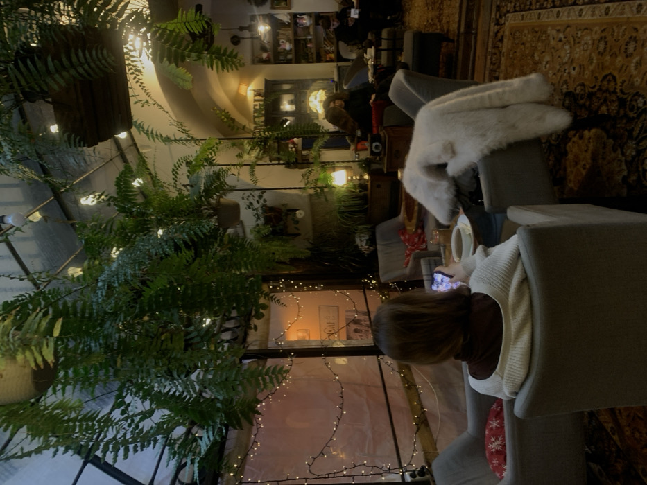 The image captures the interior of Magia Cafe, located at Szewska 21 in Krakow, Poland. The scene presents a dimly lit, indoor cafe environment characterized by a glass or translucent ceiling from which numerous ferns and potted plants hang, creating a conservatory or greenhouse aesthetic. String lights are draped across the ceiling structure and also adorn a large window or glass partition on the left, behind which a faint "CAFE" sign is visible. The floor is covered by a patterned rug in shades of brown, gold, and orange. In the foreground, a female individual with light brown hair is seated with her back to the viewer in a grey upholstered armchair. She is wearing a white sweater over a brown turtleneck and is holding a dark smartphone horizontally with both hands, appearing to engage with its screen. In front of her, on a small, round, dark-colored table, rests a white cup containing a dark beverage with a spoon, alongside a clear glass of water. An adjacent grey armchair is visible, featuring a red pillow with white snowflake patterns. A white, fluffy coat or blanket is draped over another grey armchair to the right. In the mid-ground, an archway leads to another section of the cafe, where the word "MAGIA" is faintly discernible above the arch. This area contains additional grey armchairs and low tables. A female individual with dark hair is seated at a table, facing towards the right, and a male individual is partially visible seated at a table in the far-right background. A table lamp with an orange shade illuminates a corner, and a wooden cabinet filled with various items is visible. Overhead, pendant lights contribute to the warm lighting scheme. The background features light-colored walls and additional arched structures.