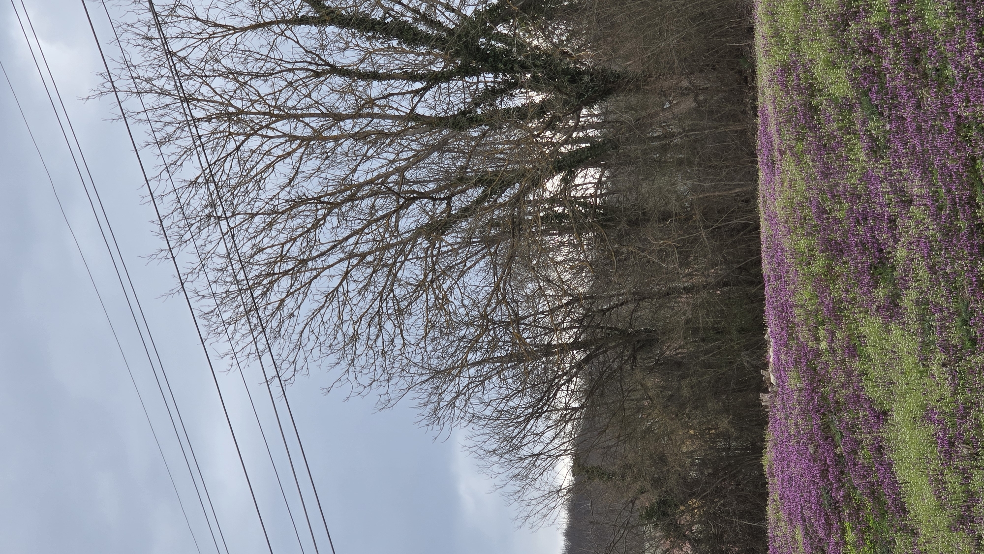 The image displays a rural landscape in Lovech, Bulgaria, under an overcast, light grey sky. Four parallel power lines traverse the upper left quadrant of the frame, running diagonally from the top-left towards the mid-right. The midground is densely populated by bare deciduous trees, their branches devoid of leaves, indicating late winter or early spring. Several tree trunks, particularly on the right, are partially covered with green ivy. A distant, indistinct treeline or low hills are visible on the horizon through the bare branches. The foreground features a wide expanse of ground densely covered with small flowering plants, forming a mosaic of predominantly purple or magenta blooms interspersed with patches of light green vegetation. No individuals, animals, or significant man-made structures are visible within the immediate scene.