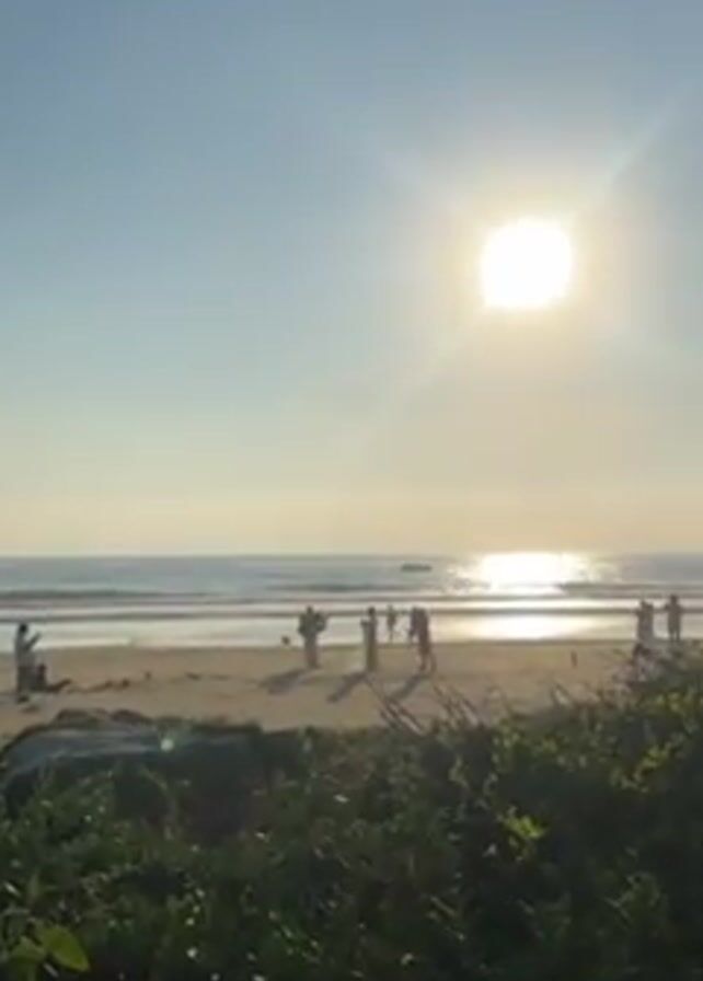 The video depicts a beach scene with a group of people, including a person in a wedding dress, being photographed. The sun is shining brightly, creating a glare on the ocean water. There are at least five other people on the beach, some of whom appear to be taking photographs. The environment includes sand, water, and some greenery in the foreground. The general atmosphere appears tranquil with the sound of nature included in the recording.