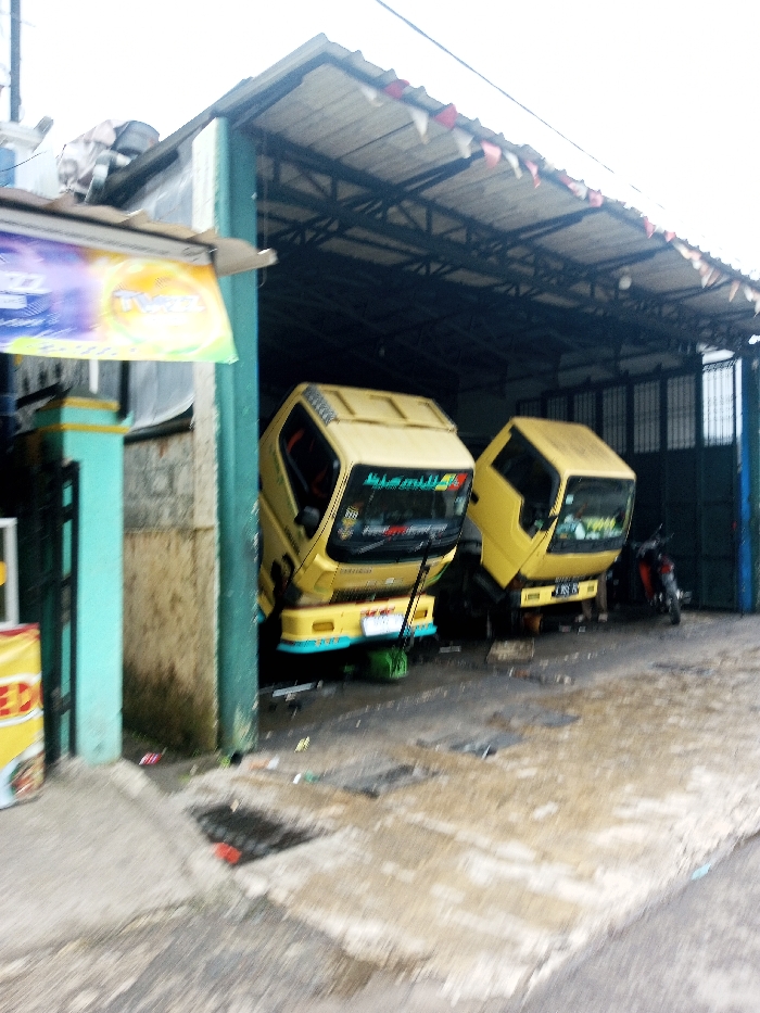 Two small yellow trucks are parked under a large covered structure. A motorbike sits further back under the roof. The foreground shows a light-colored concrete surface, likely a sidewalk or driveway, marked with stains and a small drain or grate. To the left, a faded advertisement is partially visible next to a teal-painted support post. The overhead structure has a metal frame and is decorated with small flags.