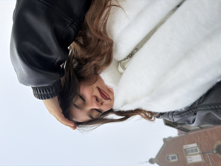 A young woman tilts her head, eyes closed, and tongue slightly protruding. She wears a black leather jacket and a fluffy white scarf or hood. Her brown hair is partially covering her face. The background is a hazy sky and the corner of a brick building with a window and a pointed roof. The overall impression is one of casual relaxation and self-amusement in a slightly hazy outdoor setting.