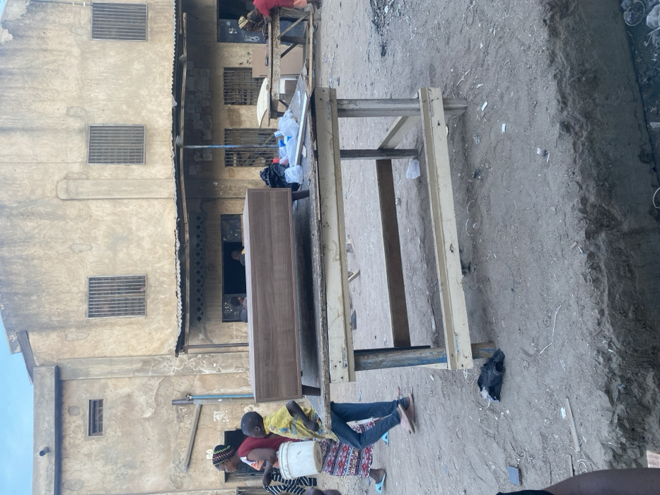 A weathered building with barred windows stands adjacent to a dusty, sandy ground. The scene is dominated by a wooden table, surrounded by various objects. Two people are walking towards the left, one carrying a white bucket. The ground contains small debris and a pair of shoes. The building appears run-down, hinting at a less affluent environment.