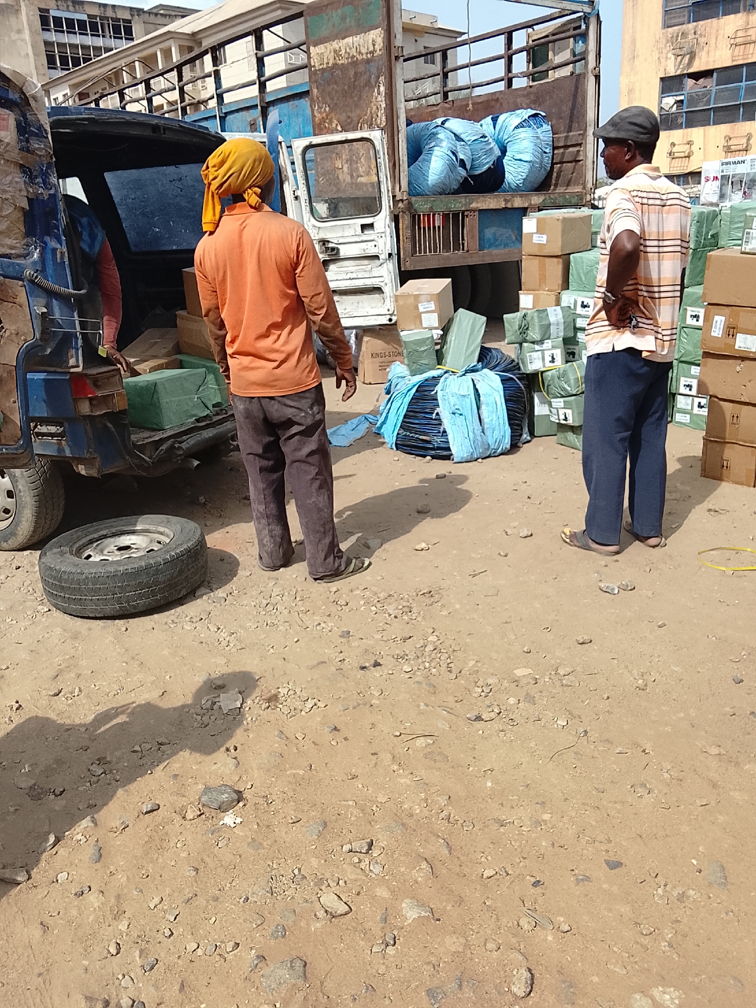The image captures an outdoor scene in Abuja, Nigeria, featuring two men unloading cargo from a blue and white truck. One man, wearing an orange shirt and a yellow head covering, stands near the rear of the truck, seemingly directing the unloading process. The other man, wearing a striped shirt and a dark cap, stands with his hands on his hips, observing. The truck is partially loaded with blue bags and cardboard boxes. More boxes and wrapped packages are stacked on the ground around the truck. A spare tire lies on the ground nearby. The ground is dry and dusty. In the background, buildings can be seen, indicating an urban or commercial area.