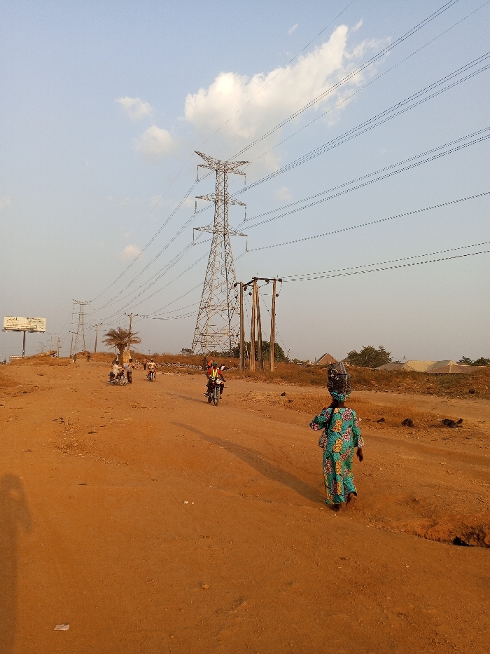 A dusty, reddish-brown road is framed by an overhead power line structure. A woman wearing a patterned dress carries items on her head. In the background, motorbikes travel along the road. A billboard is visible in the distance. The sky is light blue with scattered clouds, and the overall lighting suggests a warm, sunny day. Buildings and vegetation are seen in the background beyond the road.