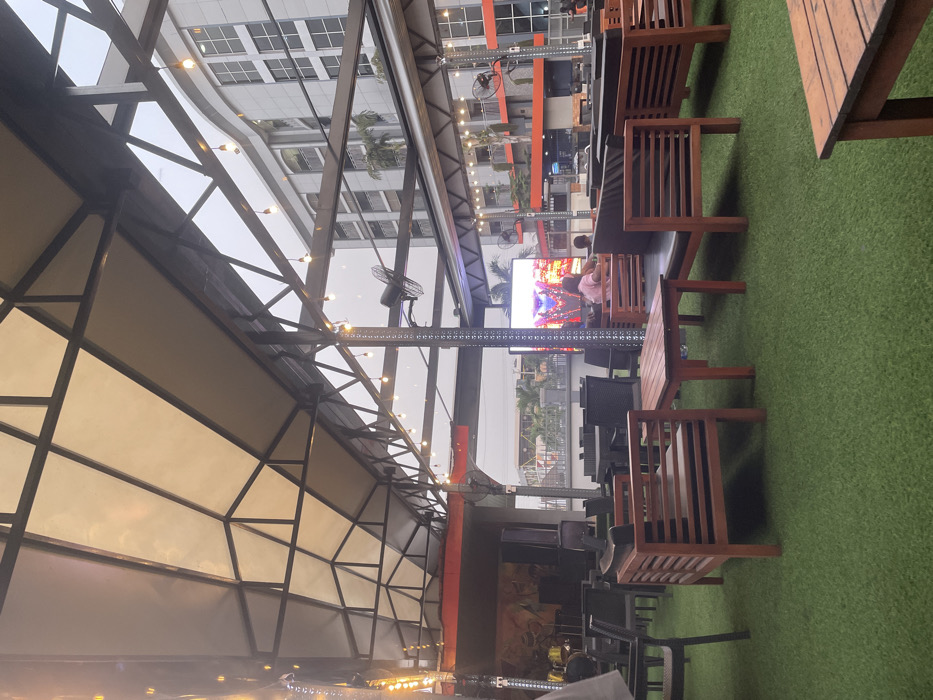 An outdoor seating area is set up with wooden benches and tables on an artificial grass surface. Above, a partial awning made of geometric patterned metal framing with translucent material covers part of the space. Through the open side, one can see tall buildings and a large screen displaying entertainment. Fans are visible along the open side, suggesting an effort to circulate air.