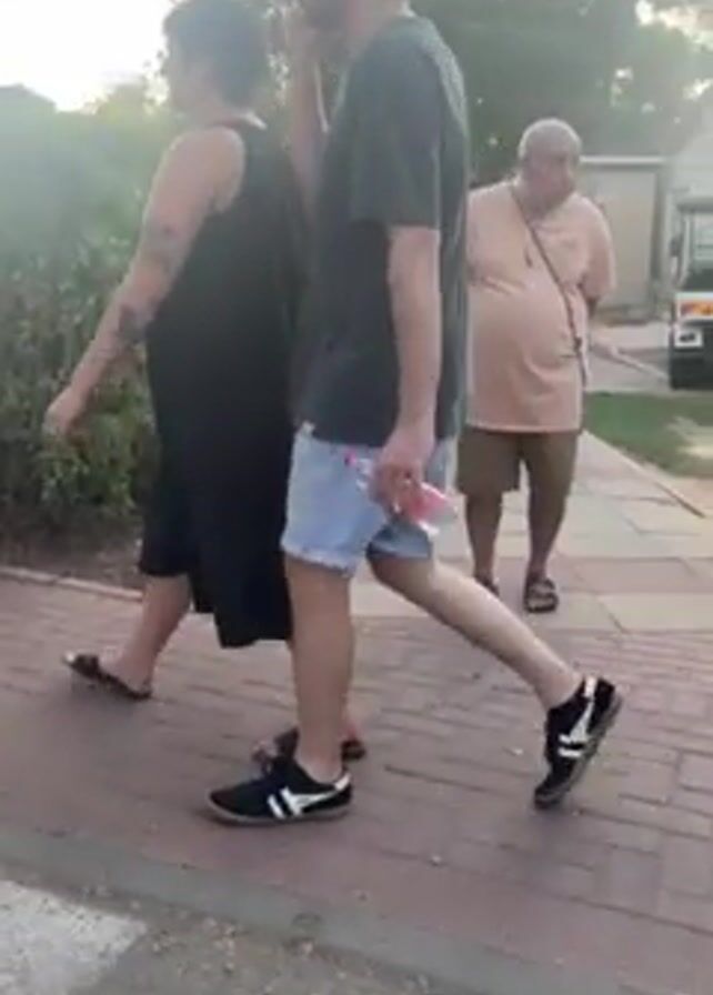 A group of four people are walking together on a brick-paved sidewalk. One person, a man, is talking on the phone and carrying a water bottle. Two women are also holding water bottles, and one of them has a tattoo on her arm. The group stops near a parked white car. The environment seems to be a residential area with greenery and other parked vehicles.