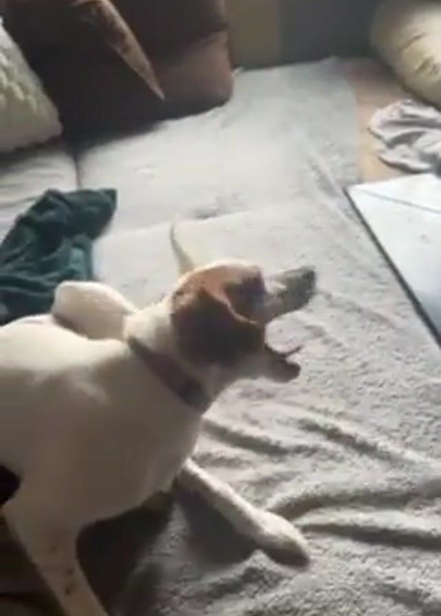 medium-sized dog lying on a gray couch. The dog is primarily white with brown spots and has a pink collar. The dog rolls onto its back and flails its legs while emitting a groan or whine. Behind the dog are several pillows and a blanket on the couch. A small black table is also visible near the edge of the couch.