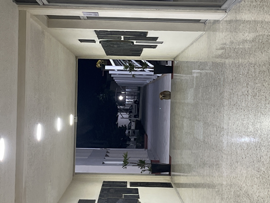The image depicts an illuminated, indoor-outdoor hallway or portico at night, located in Veracruz City, Mexico. The perspective is from within a polished terrazzo-floored corridor with light-colored walls and a ceiling fitted with multiple recessed circular lights. Dark rectangular plaques or panels are affixed to both side walls of the corridor. At the far end of the corridor, an open archway transitions to an outdoor paved area under a dark night sky. Two dark-colored rectangular planters, each containing a small green plant, flank this archway. Directly centered within the outdoor paved area, at a distance from the archway, a medium-sized, light brown dog is seated, facing towards the viewer. Beyond the dog, the outdoor space features a paved surface where at least two white pickup trucks are parked on the left side. On the right, a series of vertical white pillars or structures are visible. A single bright light source is discernible in the mid-distance on the right side of the outdoor scene, illuminating a localized area. The overall environment suggests an institutional or commercial building's exterior at night. No human figures are present.