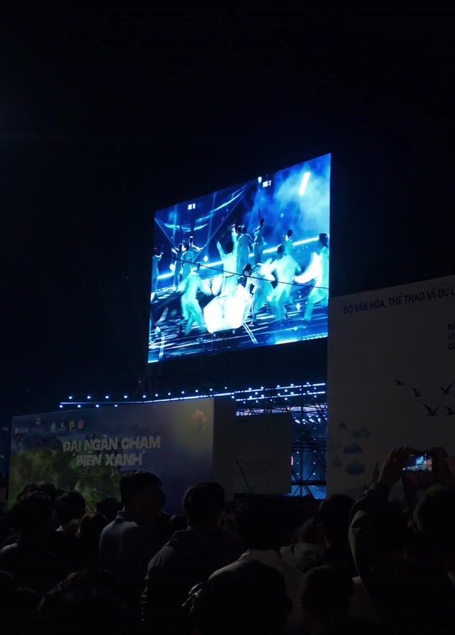 A large screen displays a performance on a stage, featuring a group of people wearing white and blue clothing. One person in the center is holding a reflective, multi-tiered object. The screen is set up outdoors at night, and a crowd of people is watching the performance. To the right of the screen, a sign is visible with Vietnamese text. The environment is dark.