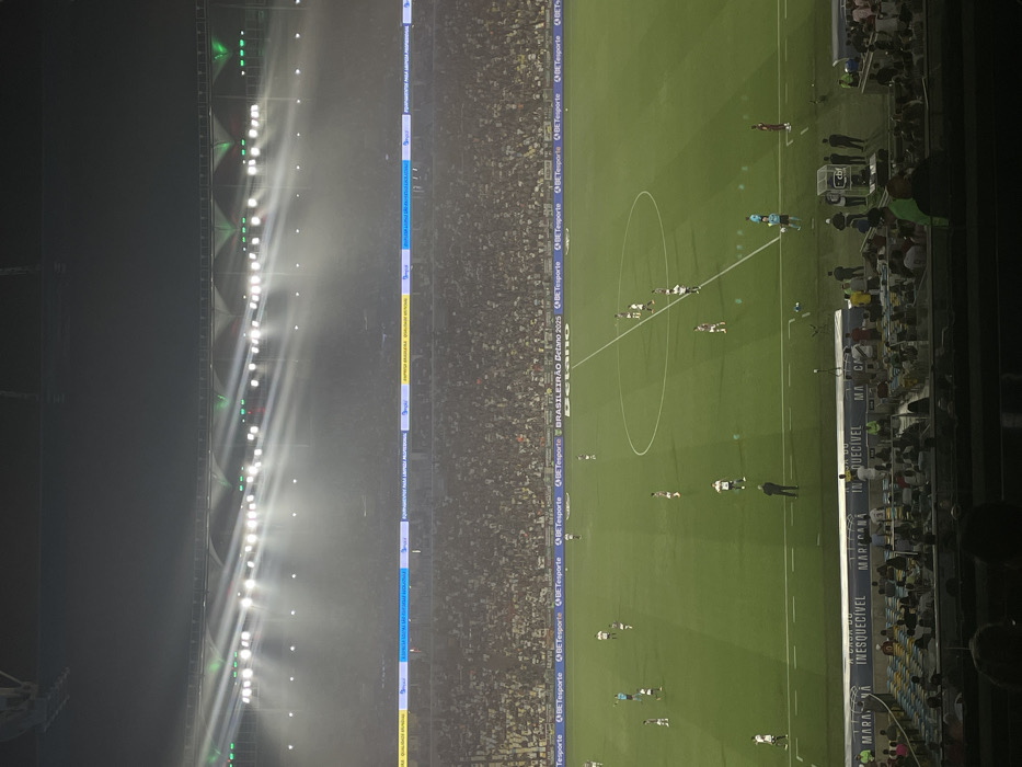 The image showcases a soccer match in progress, captured from an elevated perspective. The field is brightly lit, with visible stadium lights. The sidelines are lined with advertisements, including the phrase "BRASILEIRÃO Betano 2025." Crowds of spectators fill the stands, their faces indistinct. A sign reads "MARACANA Inesquecivel", which translates to "MARACANA Unforgettable". The atmosphere appears vibrant and energetic.