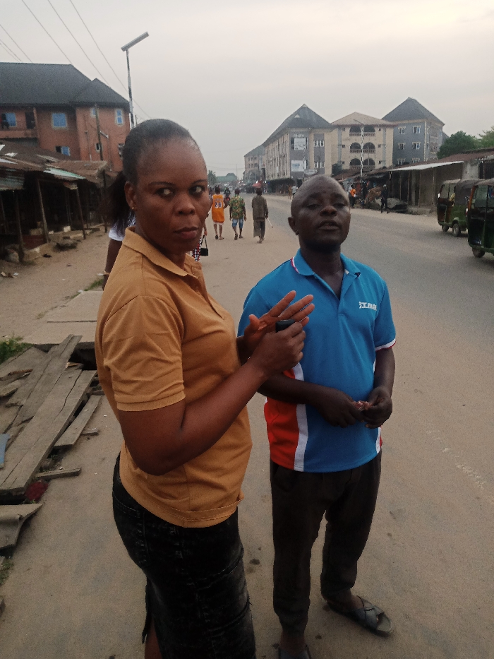 Two people stand on a street. The woman wears a yellow-brown collared shirt and a dark skirt. The man beside her wears a blue polo shirt with red and white trim, dark pants, and sandals. Buildings line the street with a mix of informal stalls and multi-story structures. Several people and vehicles are visible in the background. The overall impression is an overcast day in a bustling urban environment.