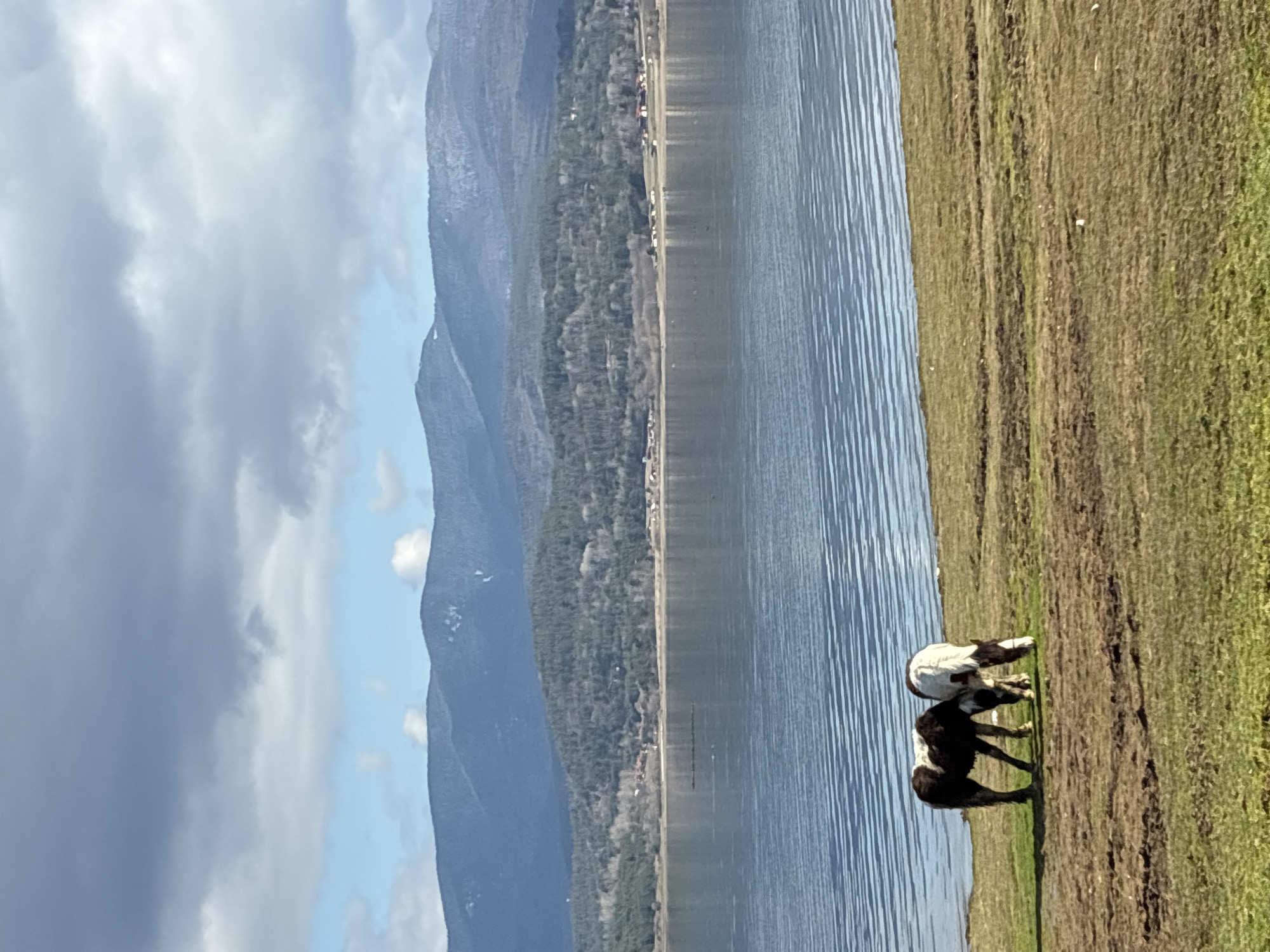 The image depicts a panoramic outdoor scene in Цигов чарк, Bulgaria, specifically at the edge of a large body of water, likely the Batak Reservoir. In the foreground, two domestic horses are observed grazing on a patchy green and brown grassy field. The horse on the left is predominantly dark brown or black with distinct white markings on its body. The horse on the right is primarily white with dark brown or black markings on its head, neck, and legs. Both animals have their heads lowered, feeding. Directly behind the horses is the calm, rippled surface of the expansive water body, reflecting elements of the sky. The far bank of the water features a thin strip of natural vegetation, including deciduous trees and some visible clustered small red-roofed structures, indicating human habitation or resort facilities. Beyond this, a series of dark, forested mountains extends across the horizon, with some peaks displaying traces of snow. The sky above is partially overcast with large, textured grey clouds, interspersed with clear patches of pale blue. Sunlight illuminates the foreground and parts of the water, suggesting a break in the cloud cover. No human figures are present.