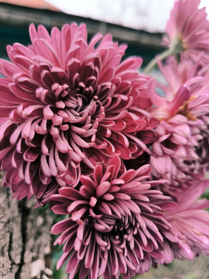 A close-up photograph displays a cluster of pink-to-magenta chrysanthemum flowers, captured in Parkhomivka, Ukraine. The primary subject is a large, fully bloomed chrysanthemum occupying the left and central-upper frame, characterized by numerous densely packed, tapering petals. Several other chrysanthemum blooms, partially obscured and out of focus, are visible in the mid-ground and right. The petals exhibit variations in color intensity, with deeper magenta tones towards the centers and lighter pink at the tips. In the blurred foreground on the far left, a textured, brown-grey tree trunk is partially visible. The background consists of an out-of-focus structure featuring a horizontal dark green band topped by a lighter, off-white section, possibly part of a building or fence, with some blurred green foliage. No individuals are present.