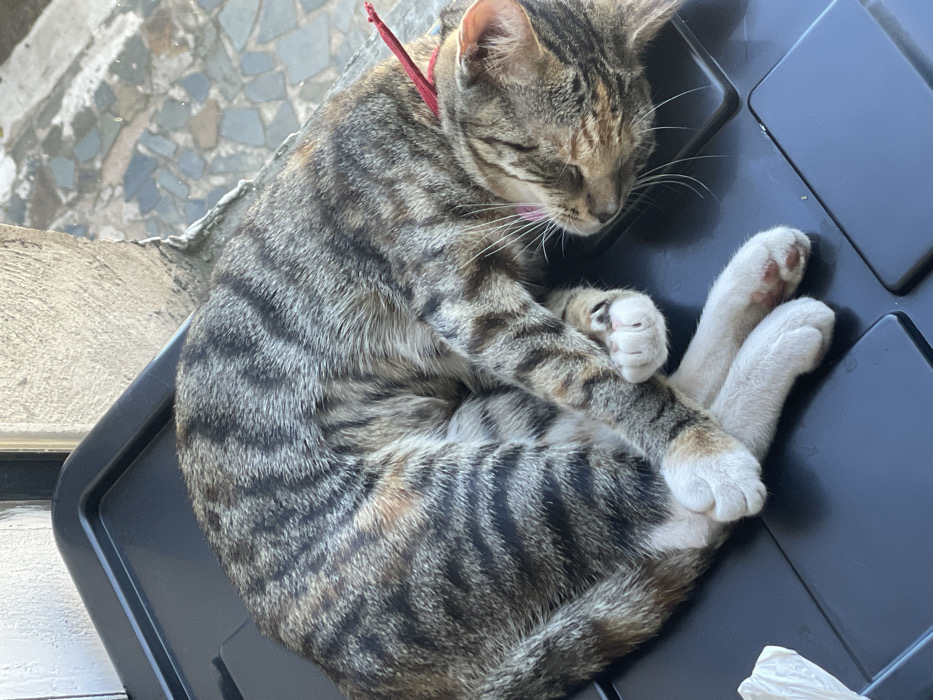 - "A tabby cat is observed sleeping curled up on a black plastic surface" by FM-2XBPe2, licensed under CC BY 4.0