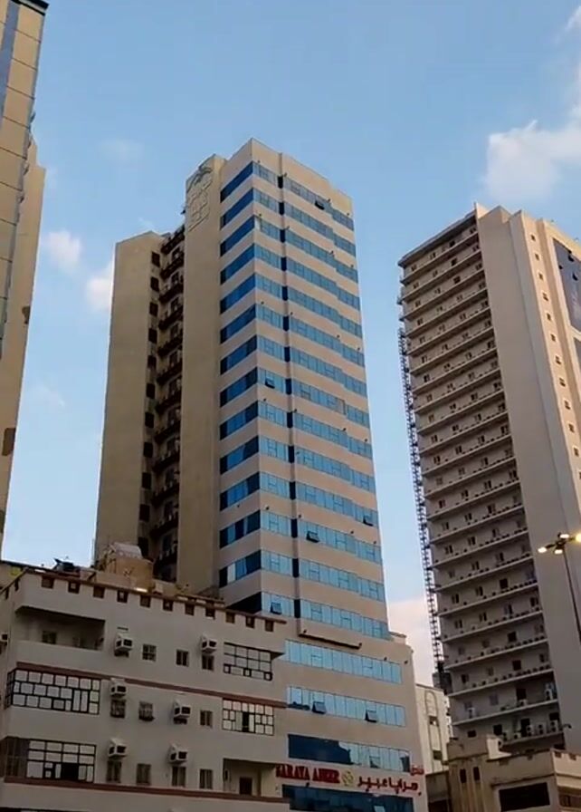 street scene in a city with tall buildings. The buildings are mainly beige and white with blue windows. One building is labeled "Al-Abbas Hotel" in Arabic and English. Several men, many wearing traditional Muslim clothing, are standing and walking on the sidewalk. One man is sitting and looking at his phone. There are cars parked and driving on the street. The sky is light blue with a few white clouds.