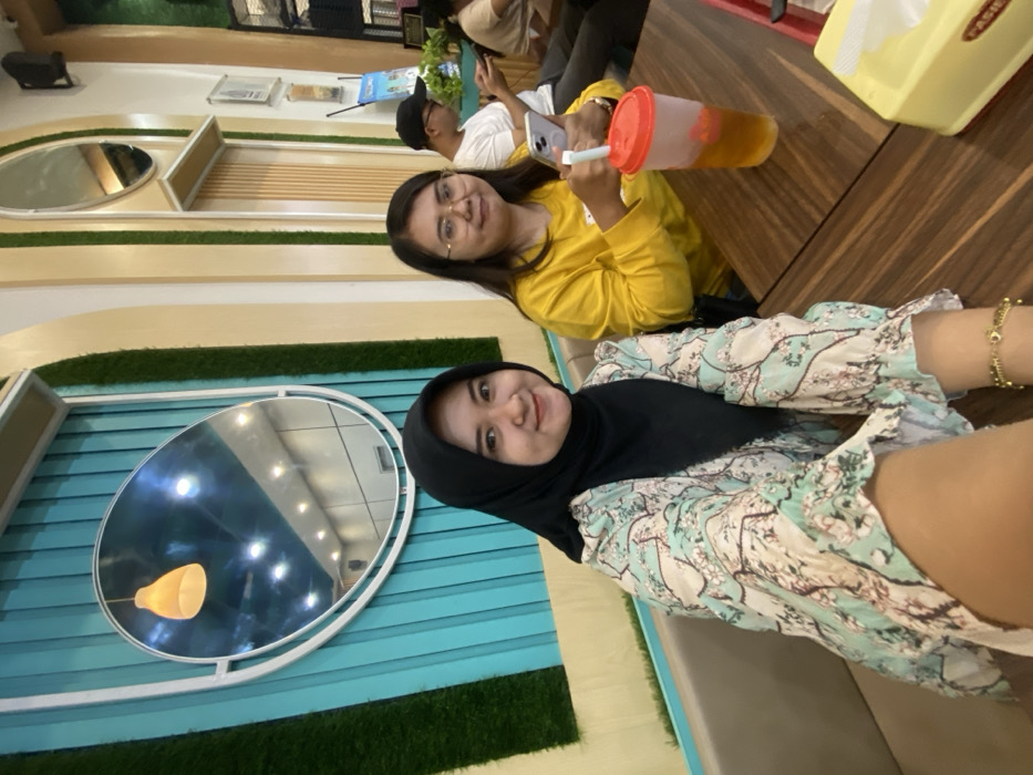 Two women are seated at a dark wooden table in an indoor establishment, identified as being located in Sidoarjo, Indonesia