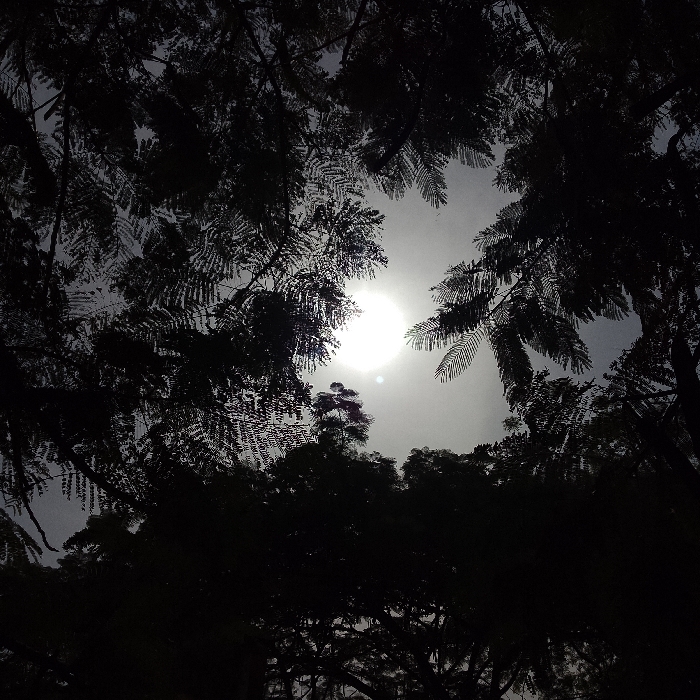 The scene, located in Barden Yana, Nigeria, depicts an upward view of a bright, circular celestial body, consistent with the sun, positioned towards the upper-left of the frame. The luminous disk generates significant glare against a light grey sky. Surrounding and partially obscuring the celestial body is a dense canopy of trees, rendered in deep silhouette. The foliage consists of numerous small, dark leaves, suggesting a compound or pinnate leaf structure. No individuals, man-made objects, or specific actions are present in the observable environment, which is dominated by the natural elements of sky and tree cover under conditions of intense backlighting.