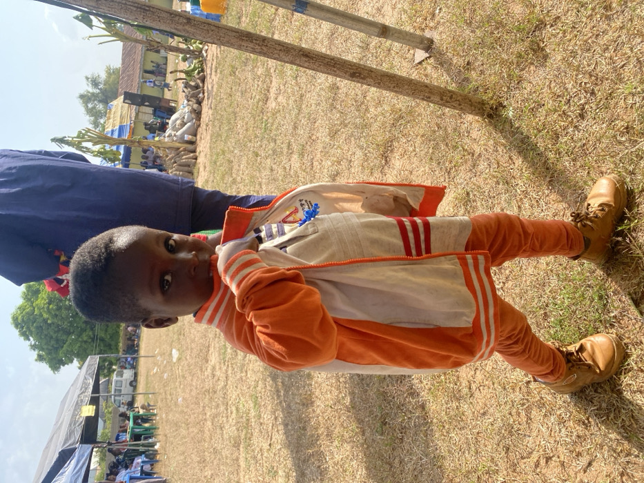An image captured in Itobe, Nigeria, shows a young child, approximately 3-5 years old, of dark complexion and short, dark hair, positioned centrally in the foreground. The child is wearing an orange and white full-zip track jacket, orange trousers, and tan lace-up shoes. The jacket is partially unzipped, revealing a light-colored polo shirt underneath with a blue cartoon design and a small blue accessory hanging near the collar. The child's right hand is near their mouth, grasping the jacket collar or zipper pull, while looking directly at the camera. The scene is outdoors under a clear, bright sky, indicating sunny daytime conditions, with shadows cast to the lower left. The ground consists of dry, sparse grass and visible dirt. In the mid-ground, to the left, a dark canopy tent is visible with several individuals seated underneath, and a white van is partially obscured behind it. To the right, numerous white sacks are stacked, along with piles of large root vegetables, likely yams or cassava tubers, some with green foliage. Two wooden poles, one with a hoe head attached, are upright in the mid-right. Further in the background, more people are gathered under a light-colored tent, and a building with a light wall and brown roof is visible. A person wearing dark blue attire is partially visible directly behind the child.
