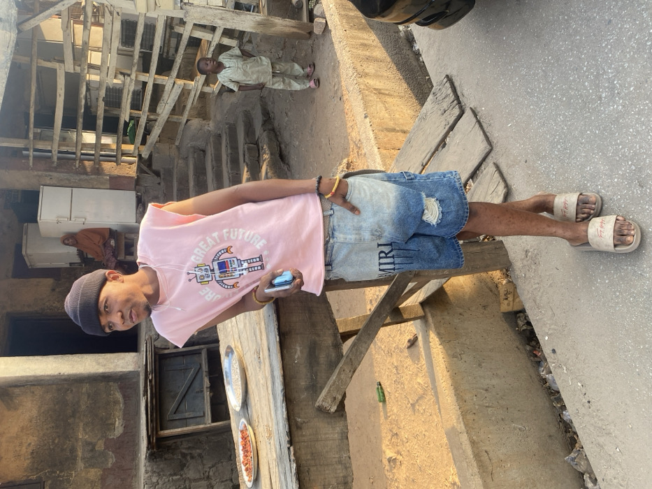 A young adult male stands in the foreground on a paved surface, leaning against a wooden table structure, in Okengwe - Obehira, Nigeria