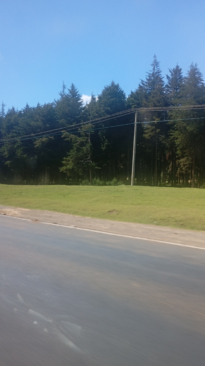 A landscape featuring a line of dense, dark green evergreen trees under a bright blue sky. A grassy field separates the trees from a road in the foreground. A power pole stands amidst the trees, with visible lines stretching across the tree line. The road shows motion blur, indicating movement of the camera.