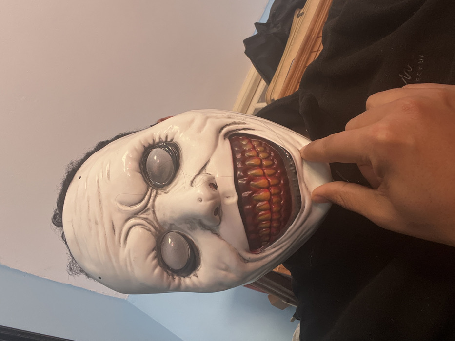 - "An individual is depicted indoors, wearing a white, grotesque mask characterized by a wide, unsettling grin with exposed, discolored yellow-orange teeth and reddish gums" by FM-PJNzU2, licensed under CC BY 4.0