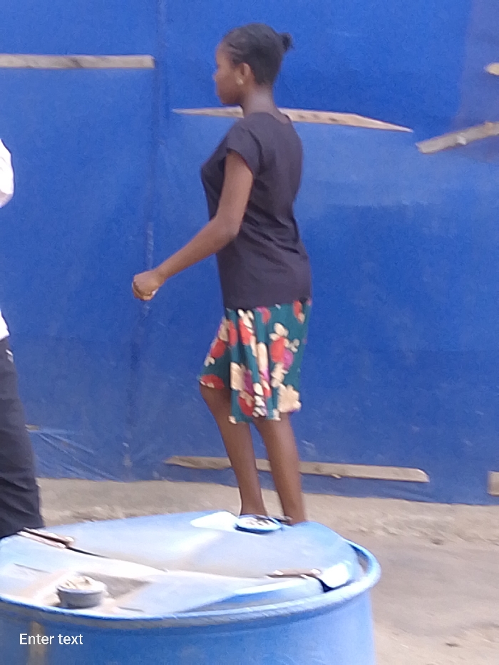 In Adankolo, Nigeria, an outdoor scene is depicted. The central figure is a young individual, likely female, with dark skin and hair styled in a bun, standing in profile, facing right. She wears a black short-sleeved top and a knee-length floral skirt with green, red, pink, and white/beige patterns. White flip-flops are visible on her feet, which are positioned on the top surface of a large, blue plastic barrel that occupies the lower foreground. Her right hand is slightly closed, possibly holding a small, light-colored object. A partial view of another person, wearing dark pants and a white top, is visible on the far left. The background consists of a solid blue surface, likely a wall or tarp, against which several light-colored wooden planks or strips are horizontally affixed. The ground around the barrel and beneath the wooden planks appears to be dirt or sand.