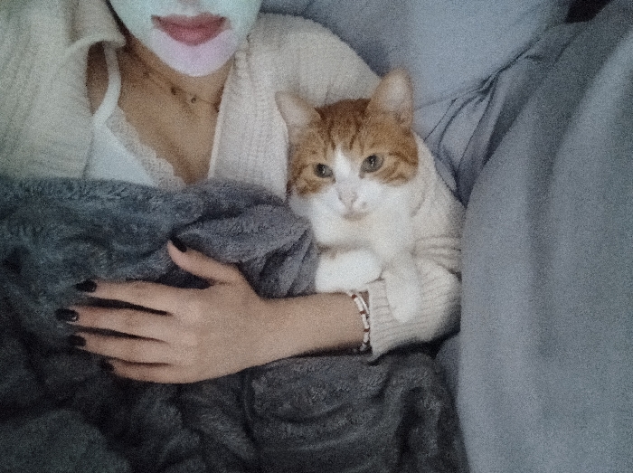 woman holding a cat in her arms, with her face covered in a white face mask. The woman is wearing a white knitted sweater and a white bra. The cat is orange and white, with green eyes and a white stripe across its face. It is curled up in the woman's arms, looking toward the camera. The woman has her arm around the cat, with her hand on its side. She has black nail polish on her fingertips. She is sitting on a gray couch, and the image is captured from the upper chest level, showing the scene from the perspective of someone standing in front of the woman. The background is out of focus and blurry. The image was taken in the city of Réghaïa, Algeria, at the coordinates 36.729, 3.369. The image is warm in tone and has a soft, gentle feel.