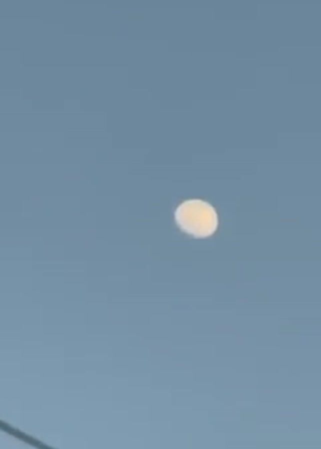view of the sky with a bright, somewhat fuzzy, white moon in the center of the frame. Below the moon are power lines in the foreground. The sky is a light blue color. The moon appears to be in a partial phase. There are sounds of human speech in the background.