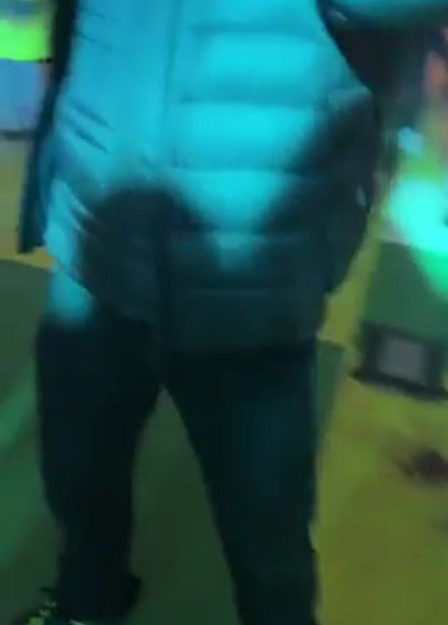 person wearing a black jacket, yellow hoodie, blue cap, and reflective yellow glasses holding a cup with a Halloween theme