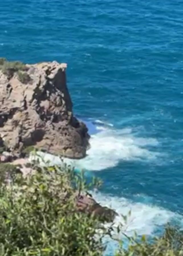 From an elevated position, the video shows a rugged, rocky cliff jutting into a vibrant blue ocean