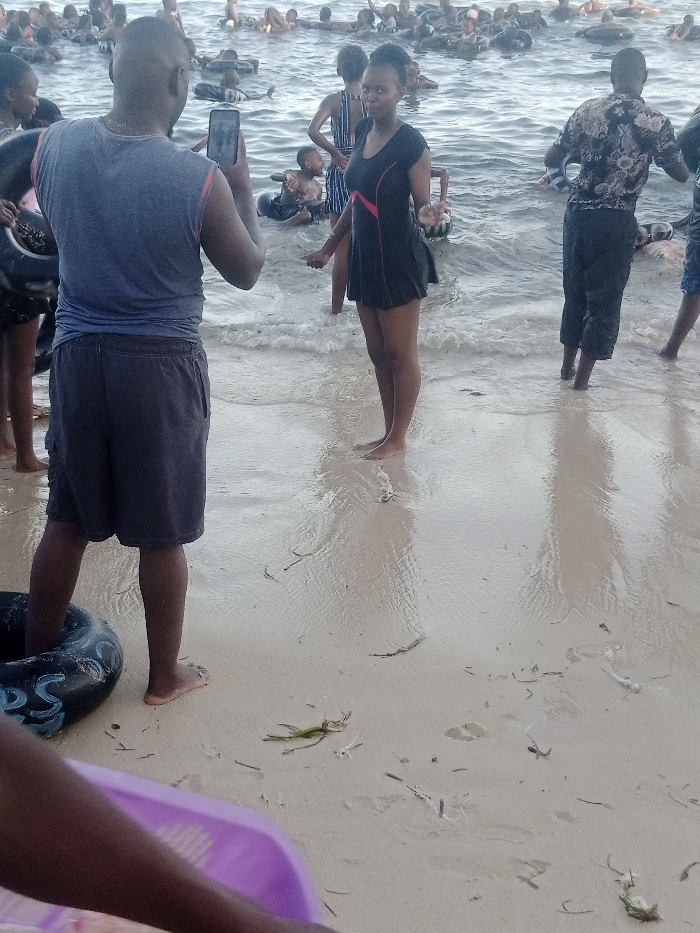 The image captures a crowded beach scene in Shanzu ward, Kenya
