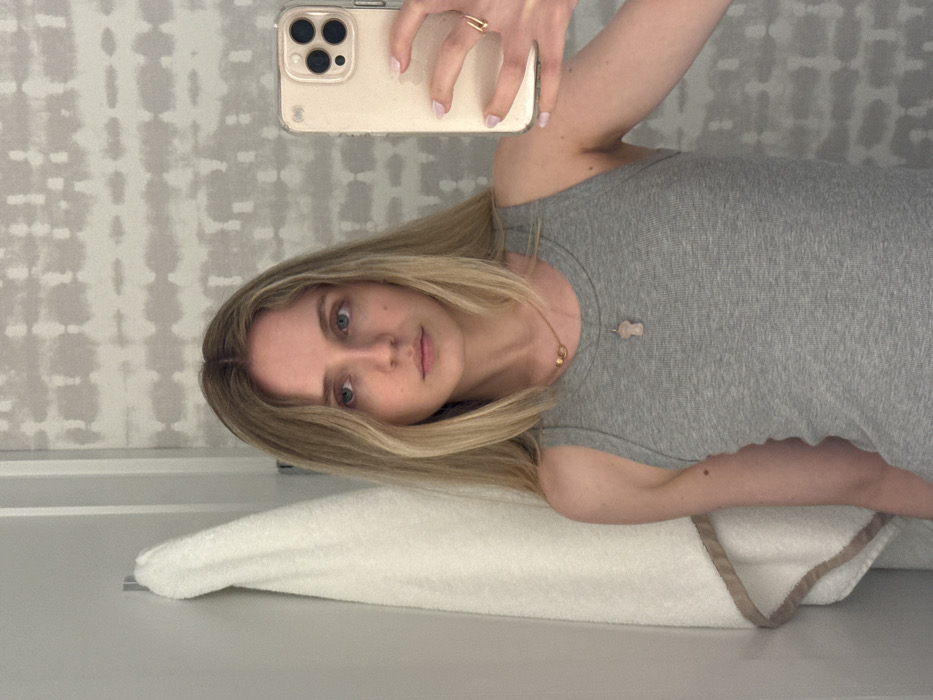 A female subject is captured in a mirror selfie within an indoor setting in Coral Gables, United States of America. The subject has long, straight blonde hair with a central part, blue eyes, and fair skin. She wears a grey ribbed tank top and a gold chain necklace with two interlocking rings and a light-colored, bear-shaped pendant. A gold ring adorns the fourth finger of her right hand. This hand holds a light-colored smartphone, featuring a triple-lens camera array, used to photograph the reflection. Her fingernails are painted light pink. To the left, a white towel with a light brown edge hangs from a silver wall hook. The background wall is covered with a light-toned wallpaper exhibiting an abstract, horizontal stripe pattern. The environment is consistent with a private residence or hotel bathroom/dressing area.