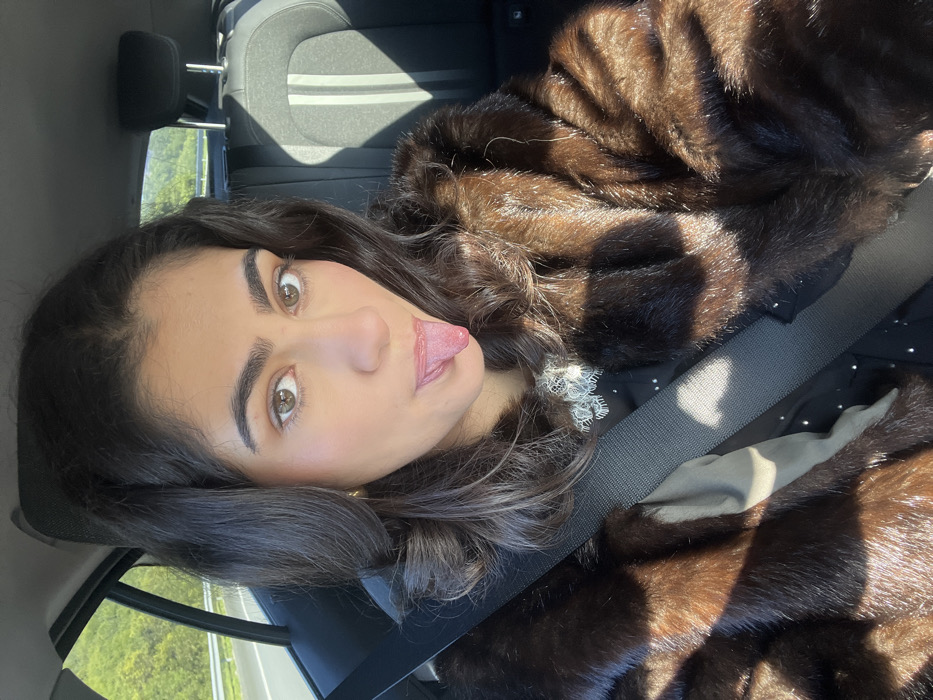 The image displays a female subject occupying the front passenger seat of a vehicle in Caminha, Portugal. She has dark, wavy hair, distinct dark eyebrows, and light brown eyes, looking directly at the camera. Her mouth is open, and her tongue is extended outwards. She is wearing a dark brown fur coat over a dark garment with a white lace collar and small, light-colored embellishments. A black seatbelt is securely fastened diagonally across her chest and shoulder. Direct sunlight illuminates the interior, creating sharp shadows on her clothing and the car's interior surfaces. Visible behind her is a dark gray passenger seat with lighter stripes on its backrest. Through the vehicle's windows, a road with a guardrail and undulating green, tree-covered terrain are discernible under a bright, clear sky.