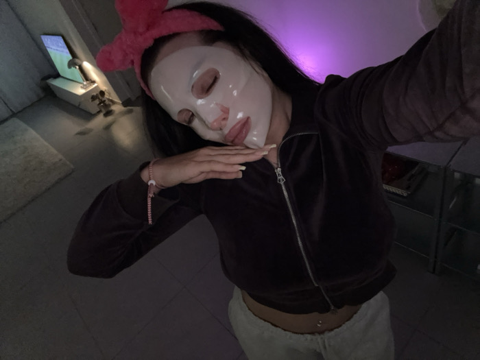 An individual is depicted in an indoor residential setting, consistent with a private residence in Tielrode, Belgium. The subject is a female with long dark hair, wearing a pink bow-shaped headband. Her face is covered by a translucent sheet mask. Her eyes appear closed or mostly closed, and her lips are slightly parted, exhibiting a glossy texture. She is wearing a dark brown, possibly velour, zip-up jacket, partially unzipped to reveal her midriff and a navel piercing. Light-colored pants are visible below her waist. Her right arm is raised, consistent with holding a camera for a selfie. Her left arm is bent, with her hand resting near her left shoulder/chest area, displaying manicured nails and a light pink bracelet on her wrist. The background on the left includes a light-colored rug on a dark floor, and a white console table with a glowing electronic device (tablet or laptop) displaying a green-blue screen, illuminated by a small lamp. A blurry decorative object is beside the lamp. The background on the right is darker, showing a multi-shelved unit. The room is dimly lit with a prominent purple light source emanating from the upper right, casting a magenta hue on the wall.