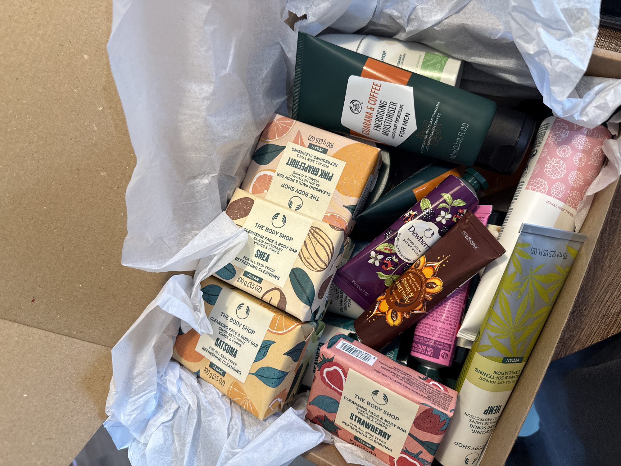cardboard box filled with Body Shop products. The box contains various soaps, moisturizers, and hand creams. Soaps include Strawberry, Satsuma, Pink Grapefruit and Shea. Moisturizers include Hemp Hand Protector, Dewberry Hand Balm, Ajwa Date & Honey Hand Balm, and Guarana & Coffee Energizing Moisturizer for Men. The box is lined with white tissue paper. The location is unknown and not necessarily Sofia, Bulgaria.