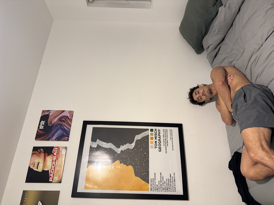 A male subject is depicted lying on his back on a bed in a room located in Bondi, Australia. The subject, an adult male with dark, curly hair, a mustache, and stubble, is shirtless and wearing dark grey athletic shorts. His forearms are crossed over his torso as he looks directly towards the camera with a neutral expression. The bed is covered with grey bedding, and a grey pillow is positioned against the white wall on the right. A crumpled black garment lies on the bed to the subject's left. The white wall behind the bed is adorned with several items. Three album covers are mounted above the bed: a partially visible gold cover on the far left, "Radiohead - The Bends" in the center, and "RÜFÜS DU SOL" on the right. Below these, a large framed poster for "Tom Misch - Geography" displays an orange and dark grey silhouette design with a tracklist and release information. A small window with a white frame and white blinds is visible on the upper right wall.
