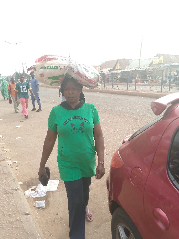 A woman walks along a street, carrying two large sacks on her head. She wears a green shirt, dark pants, and sandals. In her hand, she holds a dark object. Beside her is a red car, parked on the side of the road. Other people are visible in the background, walking in the same direction. There is litter on the ground near the curb. Buildings and market stalls line the street in the distance.