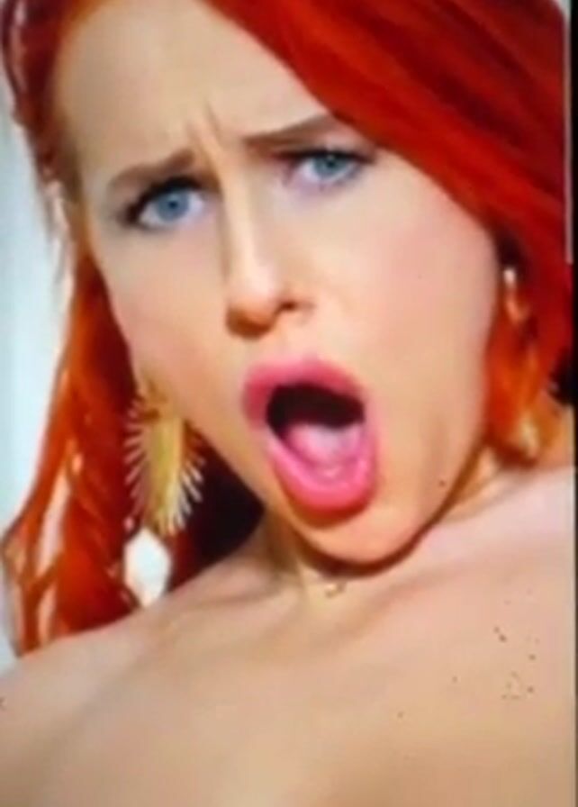 A close-up shot shows a red-haired woman with blue eyes and a surprised expression. Her mouth is open, revealing her tongue. She has fair skin and is wearing gold earrings and a necklace. The background appears to be a blurred white wall. The video quality is slightly grainy.