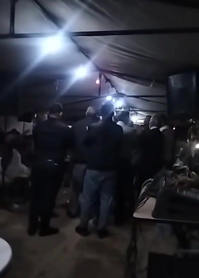 group of people inside a tent-like structure. Some are standing, others are seated. There are tables with drinks and fruit. The lighting is bright, with visible light fixtures. People are dressed in a variety of outfits, including suits, jackets, and jeans. Music is playing in the background.