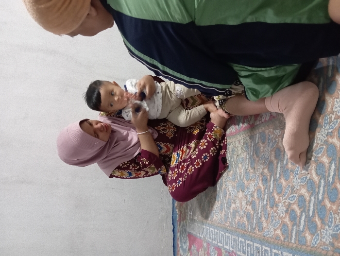 An indoor scene in Bulukandang, Indonesia, features three individuals on a multi-colored patterned rug against a plain light-colored wall. An adult female, wearing a light purple hijab and a maroon dress patterned with gold, brown, and light blue motifs, sits cross-legged, supporting an infant. The infant, wearing a light-colored top and pants, holds two small dark blue cylindrical objects in its raised hands and gazes towards the right. An adult, partially visible from the right side, wears an orange head covering and a dark blue long-sleeved garment with a prominent light green vertical stripe, with a light pink sock covering their right foot. The female on the left is positioned to interact with the infant, while the infant appears to be observing the third individual on the right.