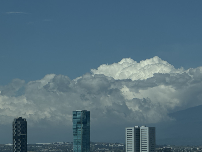 The image depicts an elevated view of the Angelópolis district in Puebla City, Mexico, under a dynamic sky. The upper portion of the frame is clear blue. Below, a large formation of dense, white cumulus clouds with darker gray undersides dominates the mid-section, extending across the horizon. In the lower half, three distinct modern high-rise buildings are prominently visible against the backdrop of the city's urban sprawl. From left to right: 1. A dark, multi-story tower with a geometric, grid-like facade. 2. A tall, slender skyscraper, identified as Torre Helea, characterized by its reflective blue-green glass exterior and curved architectural design. 3. A twin-tower complex composed of two light-colored, rectangular buildings featuring numerous horizontal window bands. Beneath these structures, the cityscape extends with numerous lower buildings and residential areas. In the far distance, on the right side of the frame, a large mountain or volcano is faintly discernible through the atmospheric haze and clouds. No individuals are visible.