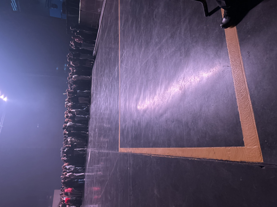 A large crowd stands adjacent to a stage. The stage, illuminated by a light streak, is marked with painted yellow lines. At the edge of the stage, a person's black shoe can be seen. The lighting is low and gives the scene a dim and slightly eerie atmosphere.