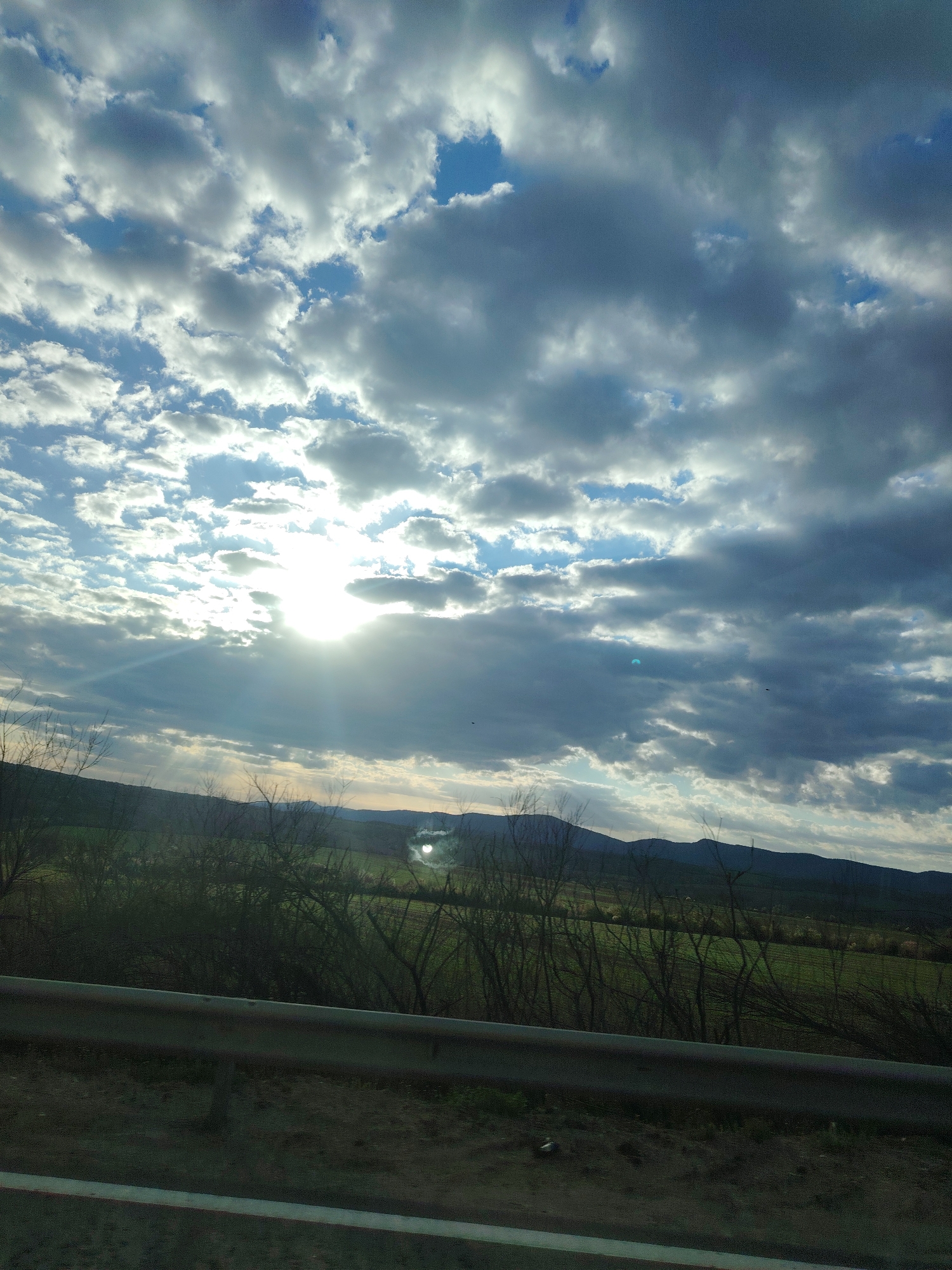 landscape under a cloudy sky with bright sunlight piercing through the clouds. A mountain range is visible in the distance, with a green field and bare trees in the foreground. A guardrail runs along the bottom of the image, indicating the presence of a road. The specific location, Kilifarevo, Bulgaria, cannot be conclusively verified from the image content alone, but the landscape is consistent with a rural or semi-rural environment.