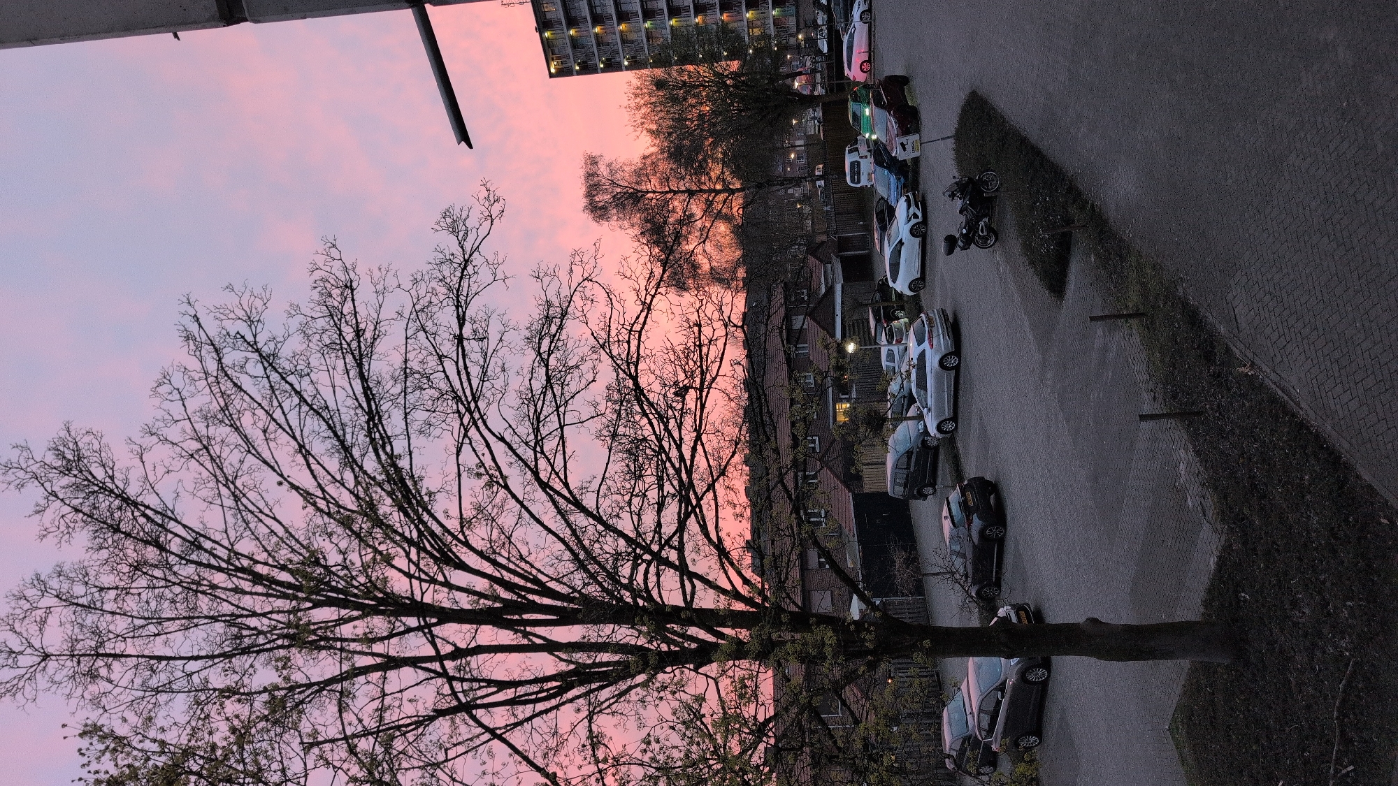 The image displays an urban residential area in Venray, Netherlands, observed during twilight. The sky exhibits prominent pink and purple hues with visible cloud formations. In the left foreground, a large, bare deciduous tree with a dark trunk and numerous fine branches extends vertically through the frame. Adjacent to it, a paved parking lot occupies the midground, containing approximately 20 parked vehicles. These include various cars in colors such as silver, white, dark grey, blue, and red. A single black motorcycle is parked on a narrow, landscaped median strip within the lot. A white sign with "CAMERA BEWAKING" (Camera Surveillance) text and a camera icon is affixed near the motorcycle. A row of residential houses with orange tiled roofs and several illuminated windows is visible in the background, behind the parking lot. To the right, a multi-story apartment building with numerous lit windows and balconies stands prominent against the sky. Additional bare trees are silhouetted against the horizon. On the far right edge of the frame, a partial view of a grey vertical structural element is present, from which a horizontal bar extends. No individuals are visible in the scene.