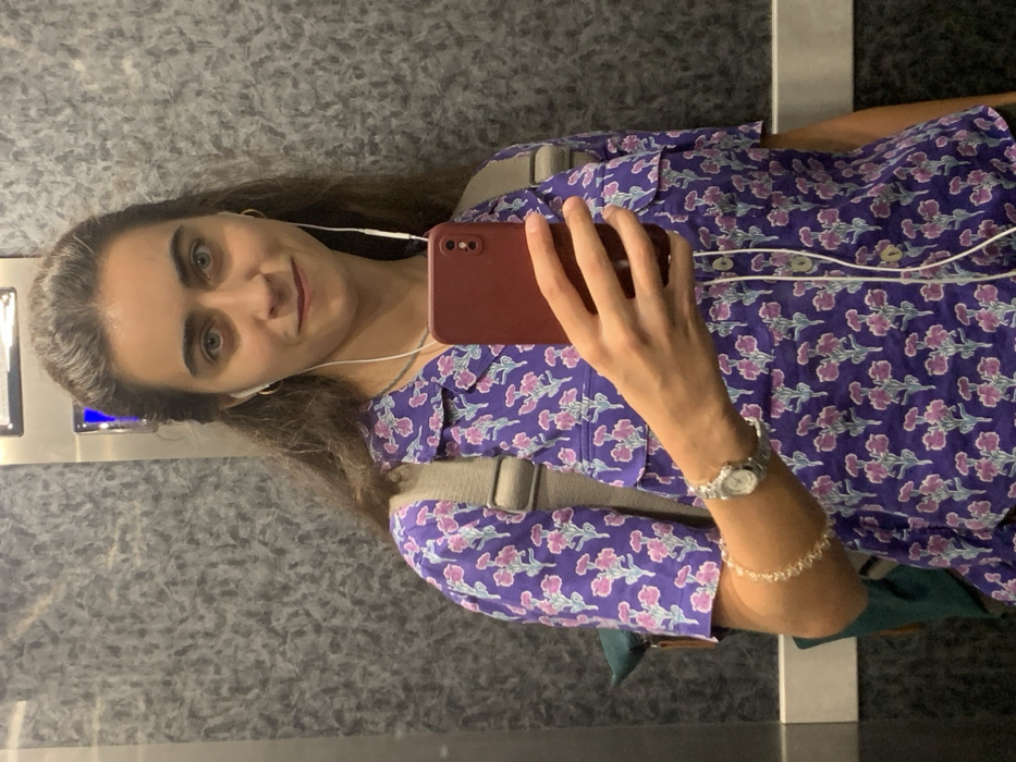 A young adult female is depicted taking a selfie inside an elevator in Lisbon, Portugal. She has long, dark brown wavy hair pulled back from her face, blue eyes, and a slight smile. She is wearing a predominantly purple short-sleeved collared shirt with a repeating pattern of pink and light purple floral motifs with green stems, secured by light-colored buttons. White wired earbuds are in both ears, with wires hanging down, and she wears small gold-colored hoop earrings. A thin, dark necklace is visible. On her left wrist, she wears a silver-toned wristwatch with a white dial and a light-colored beaded bracelet. A light tan backpack strap is visible over her right shoulder, with a dark teal section of the backpack body peeking out on her left. She holds a maroon smartphone, featuring a dual-lens camera, in her right hand, positioned to capture the image. The elevator interior features grey, speckled wall panels. A brushed metal control panel with at least two blue illuminated square buttons is visible in the background, above and behind her head.