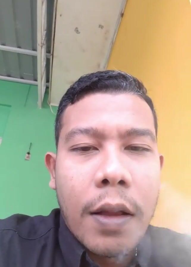 A man with short, dark hair and a mustache is looking directly at the camera. He is wearing a black button-down shirt. He exhales a puff of white vapor, possibly smoke or vapor from an electronic cigarette. Behind him, there is a green wall to his left and a yellow wall to his right. Above him, there is a corrugated metal awning. In the background, the sound of a motorcycle can be heard.