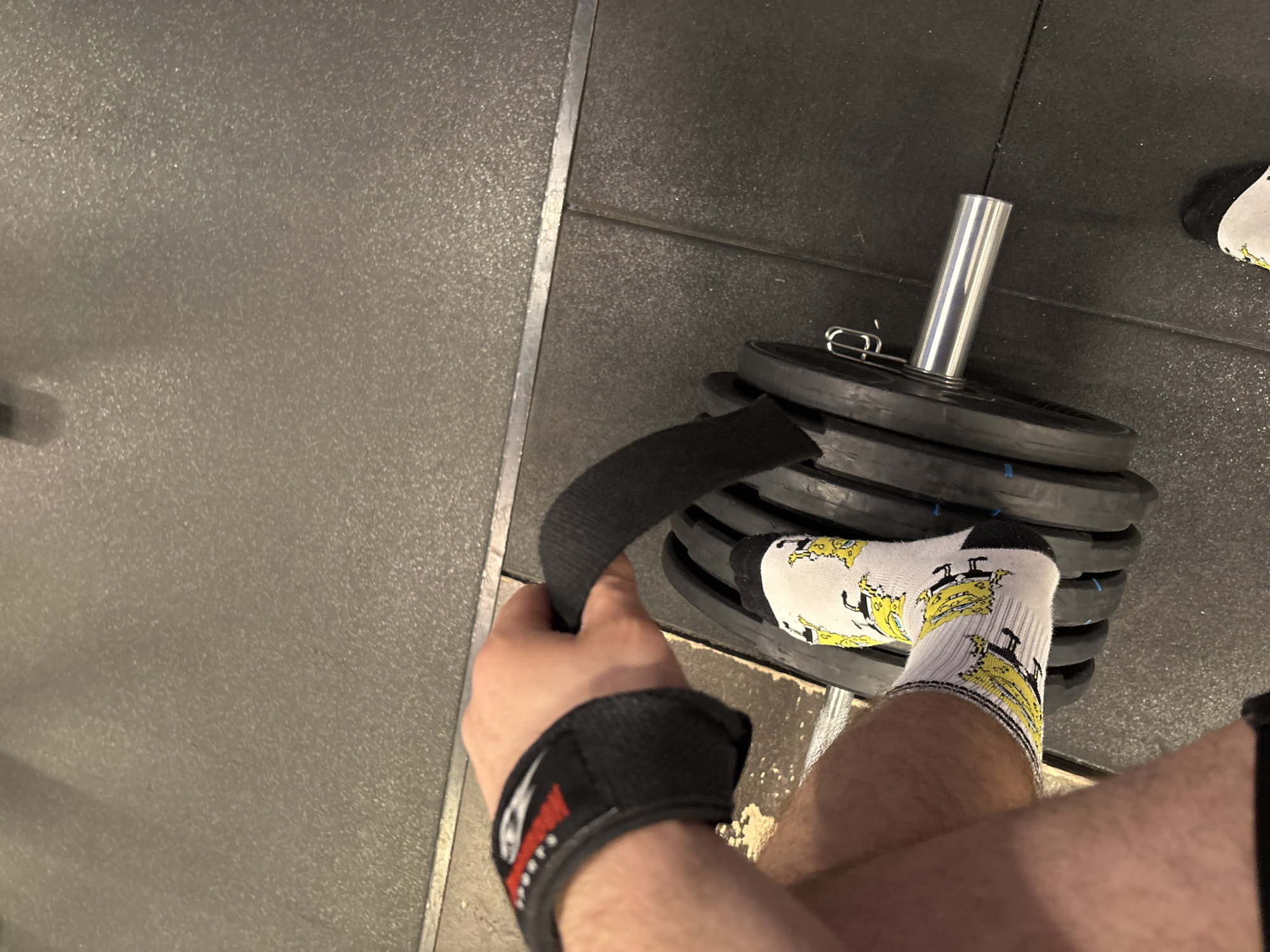 A high-angle shot depicts a person performing a weightlifting exercise. The individual is wearing a black wrist wrap on their left wrist and a white sock with yellow cartoon characters on their left foot, which is positioned close to a stack of black weight plates on a barbell. A black lifting strap is held in the person's left hand, wrapped around the weight plates. The background shows a grey, textured floor and a metal strip separating floor sections. The location is likely indoors, possibly a gym. There is no information to indicate the location is in Sofia, Bulgaria.